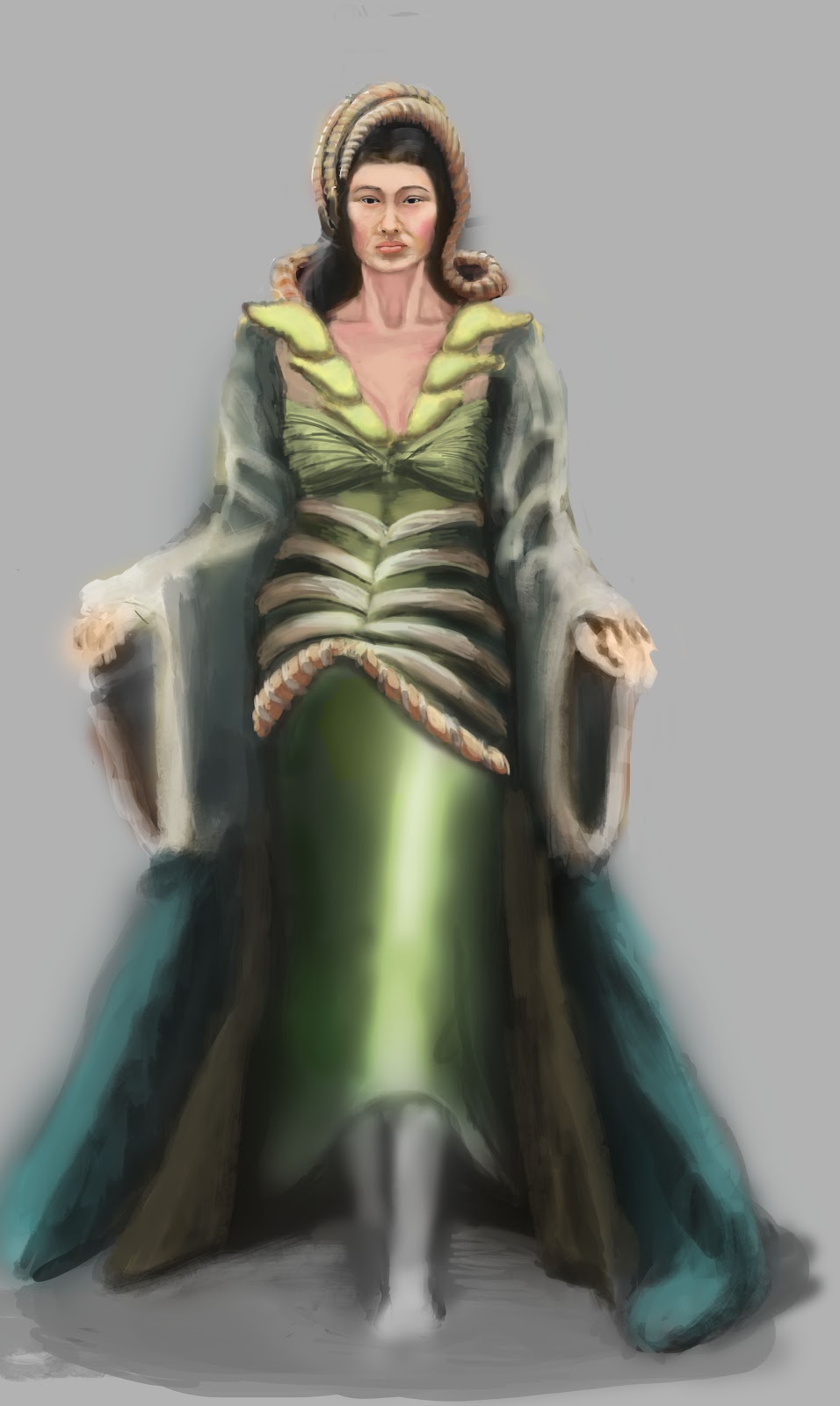 This is Morgana as imagined in the Japanese Heian period. In truth it does not have much of a nod to that period. It got a little bit sacrificed in favour of the design. The character is magical but rather than giving her a spell or pet I went for a special costume based on a dragon. I did some line work first but to be honest I am finding it hard to be disciplined and do all the design in linework. This concept changed a lot as I rendered. Not a very efficient workflow but fun.